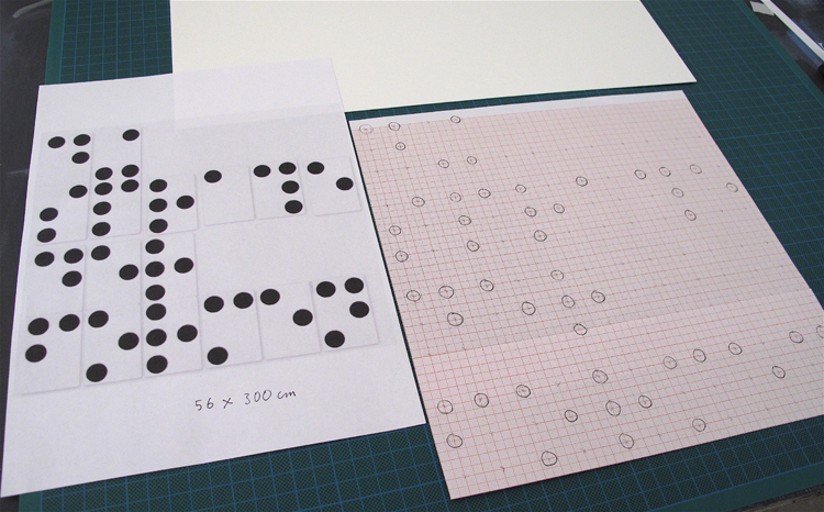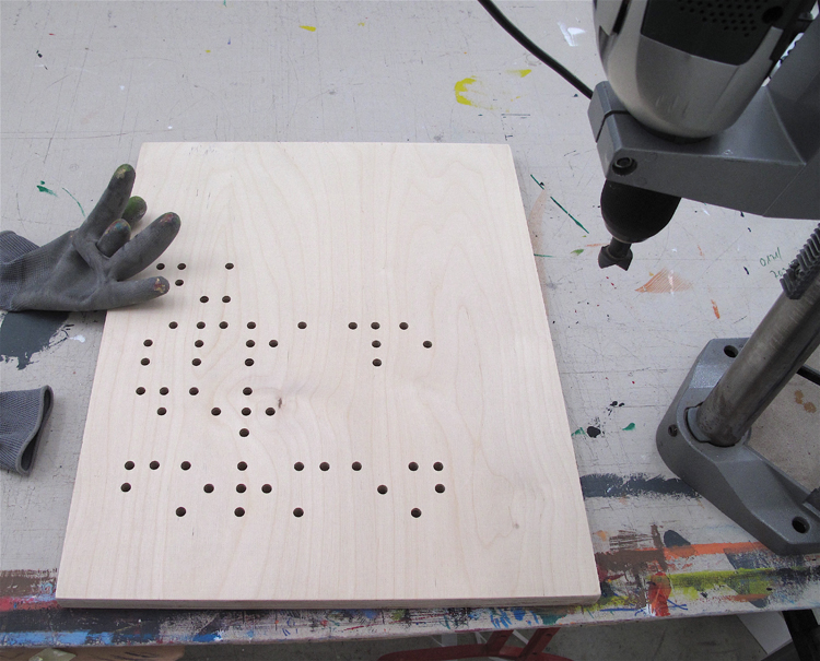 x 400 x 21 mm, Köpfe von Holzdübeln als "Schrift", weißer Acryllack).