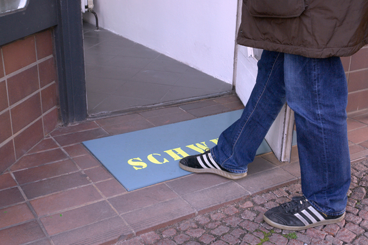 Bahnschwellen zu hunderten in Serie, Türschwellen von Fall zu Fall – unsere Türschwelle bei oqbo besonders zu den Öffnungszeiten von Donnerstag bis Samstag – meist, ohne dem große Beachtung zu schenken. Im Türbereich wird der Künstler das Fußabstreifgitter, den Fußabtreter durch ein eingepasstes farbiges Element ersetzen und mit dem Schriftzug Schwelle bedrucken. Der Übergang wird thematisiert und nicht mehr selbstverständlich sein, vielleicht werden die Besucher irritiert, vielleicht werden sie zögern? Aber was viel wichtiger ist, durch einen kurzen Impuls werden die Besucher*innen zum Nachdenken angeregt. Jedes Leben ist geprägt von diesen Situationen, jeder Mensch hat seine persönlichen Schwierigkeiten, Barrieren und Aufgaben.
