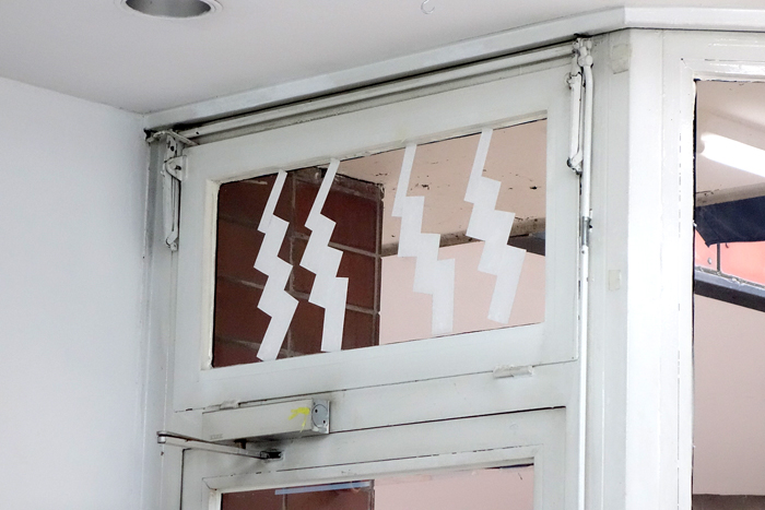 Die Arbeit SHIDE im Oberlichtfenster der Galerie oqbo ist Teil des Projektes "Rahmenhandlungen", das 2019 das aktulle Programm begleitet. Bei jeder Ausstellung wird durch einen künstlerischen Eingriff im Eingangsbereich die Frage nach dem Moment des Eintretens, nach dem Einlass und dem Ausschluss thematisiert.