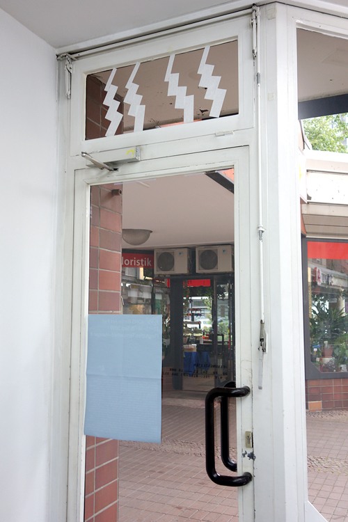 Im Oberlicht der Eingangstür der Galerie oqbo sind nun passend zur Eröffnung von paperfile # 15 vier Streifen angebracht, aus Papier, aber in die Fläche gebracht und daher ein Bild des Zeichens, nicht das Zeichen selbst.