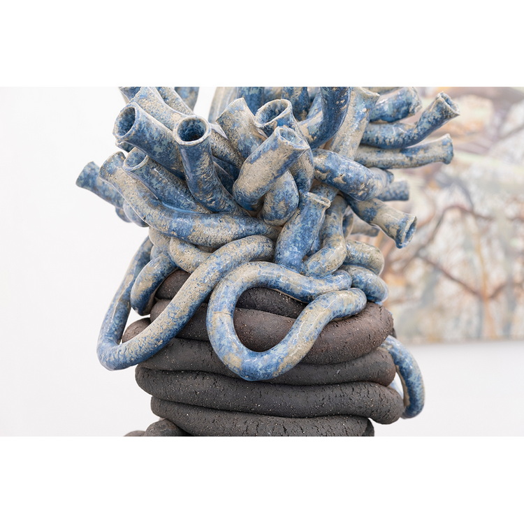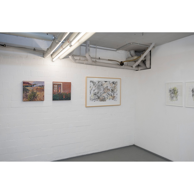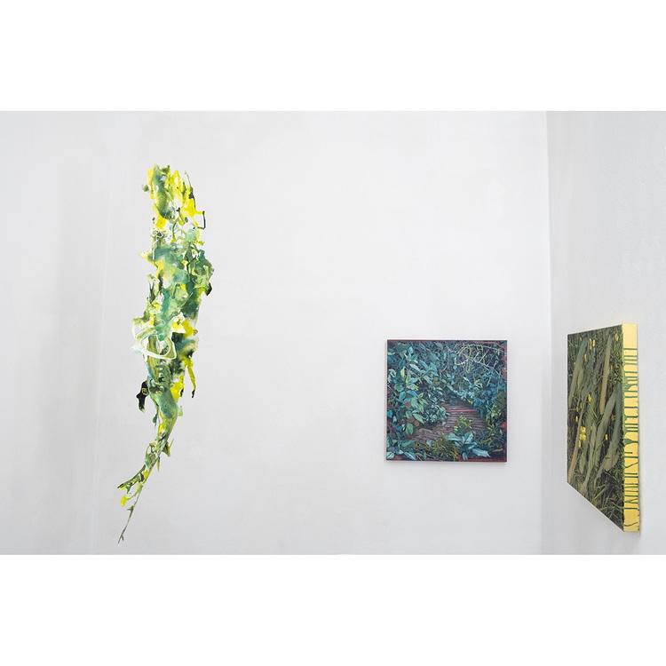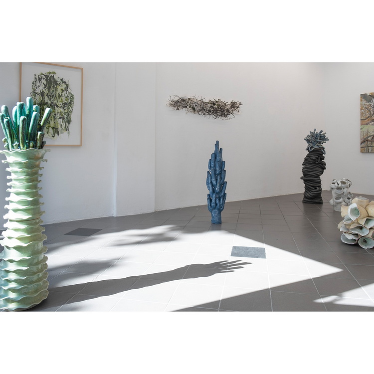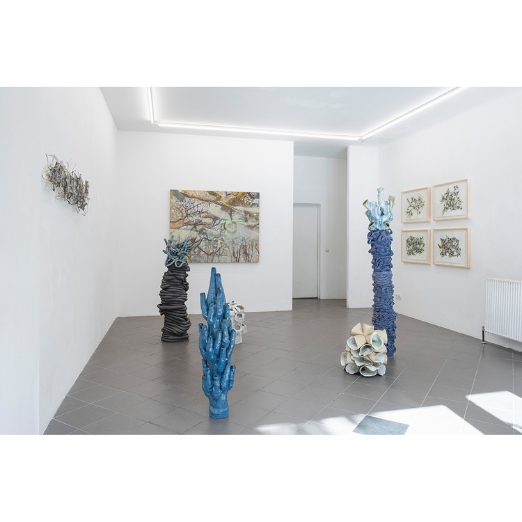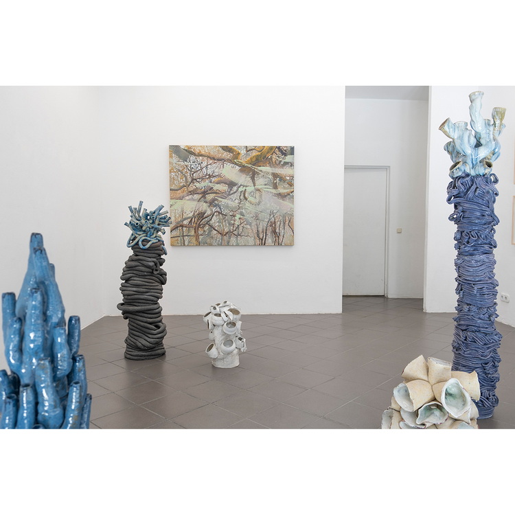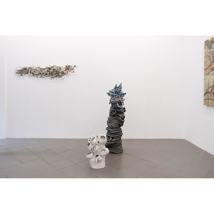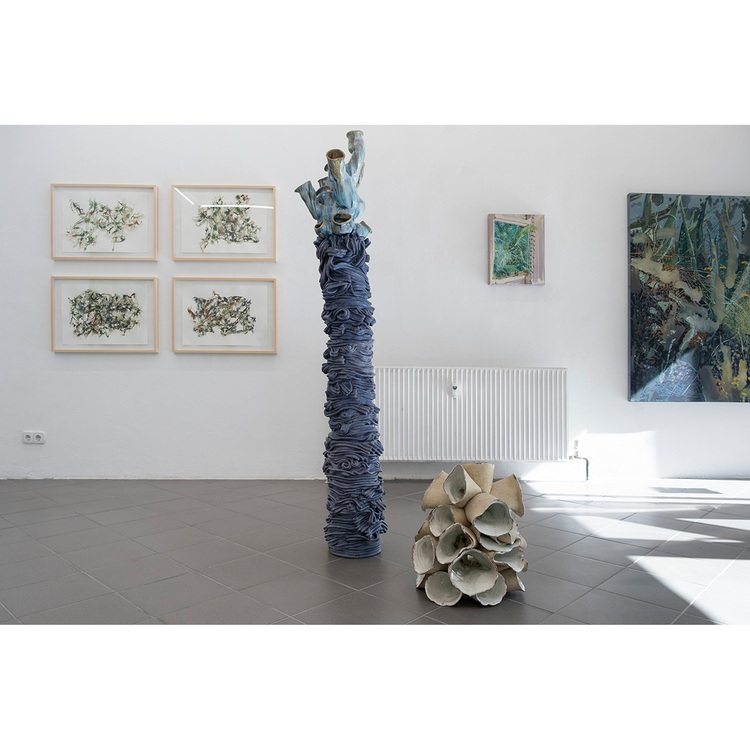 Malerei, Papierschnitte und Keramiken vereint eine Auseinandersetzung mit Raum und Plastizität. Sie verbindet die vollplastischen Keramikskulpturen botanischer Phantasien von Nils Blau mit den feinen Papierschnitte von Sabine Hilscher, die mit Licht und Schatten und der Bewegung im Raum spielen. Sabine Beyerles Malerei öffnet auf der Leinwand tiefe Räume in die Welt der Pflanzen zwischen Abstraktion, Gräsern und Blattwerk.