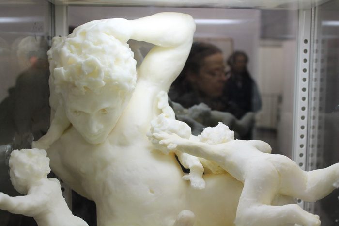 Sven Grünwitzky schreibt zu Sonja Alhäuser: „In Kühlvitrinen werden sie gelagert: die Butterkörper und Margarinenleiber. Gut, schon beinahe grell ausgeleuchtet hinter Glas. Lehnendes Hallo und Das kleine Willkommen sind ihre Namen. Bezaubernd schön in ihrer buttrigen Nacktheit bleibt ihr gehärtetes Fleisch dem Zugriff und Tastsinn entzogen. Die von Sonja Alhäuser aus dem fettigen Grundnahrungsstoff geformten Geschöpfe sind gefangen in der Blickfalle ihrer Schaukästen. Unbekümmert, teils übermütig und wie trunken von ihrem selbstbezüglichen Spiel toben und tollen sie in barocker Paraphrase durch die Enge der gläsernen Zellen.”