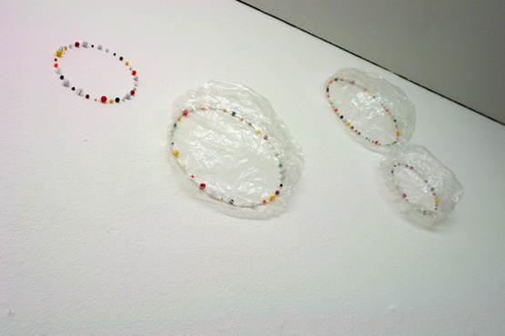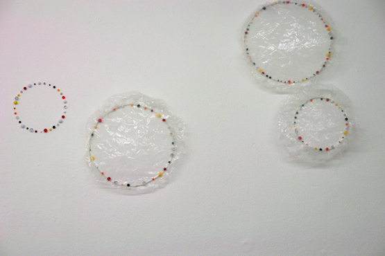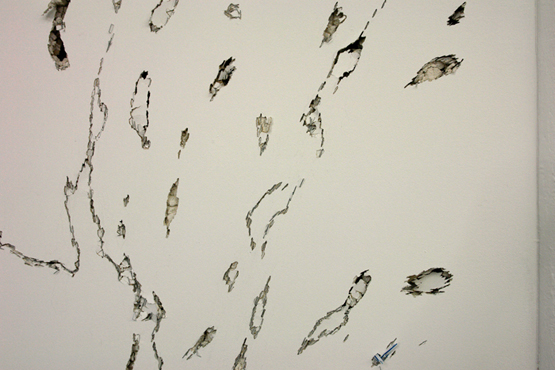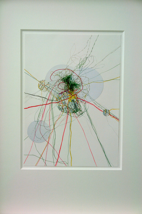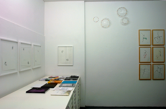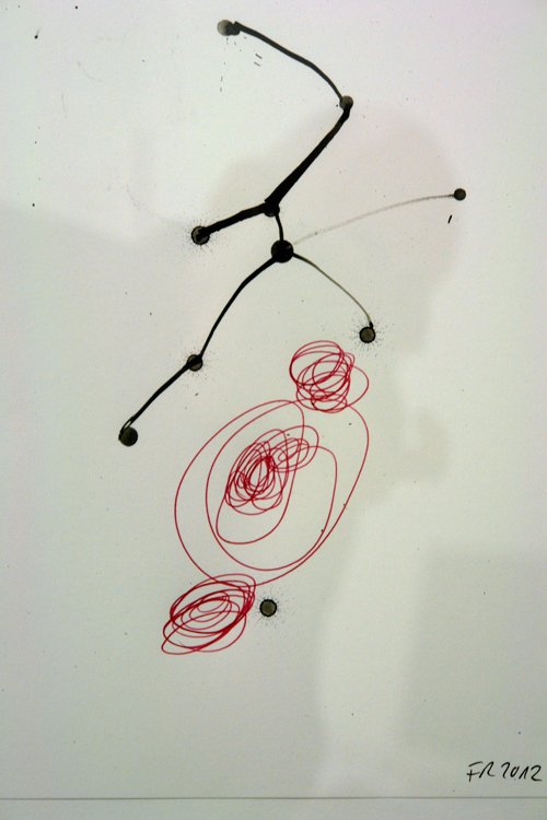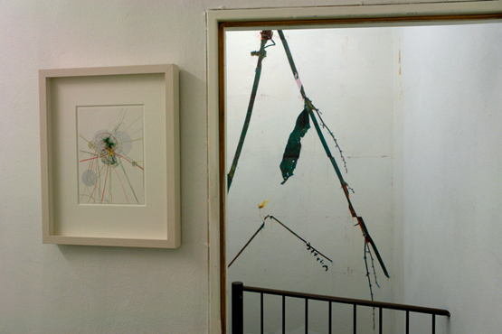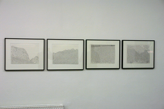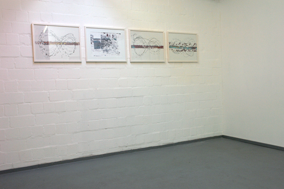 Zu sehen ist, welche Differenzierungen der einfache Bleistiftstrich auf Papier erzielen kann (Heiner Blumenthal), wie fragile Gespinste aus der Ritzung durch Kohlepapier entstehen (Nora Schattauer), welche Gratwanderung die Zeichnung zwischen Landschaftsbild und Abstraktion vollziehen kann (Jonathan Bragdon), wie die Reihung von Graphit-Bögen ein Wolkenmuster aufbaut (Heike Kern). Thematisiert sind dabei gleichzeitig Prinzipien des Zeichnungs-Prozesses. Aus fragilen Linien werden schwebende Schicht-Muster aufgebaut (Nadine Fecht), serielle Abfolgen von farbigen Aquarell-Linien loten spannungsvoll die Grenze zwischen Abstraktion und Raumvorstellung aus (Peter Jap Lim) oder sparsam gesetzte Linienschwünge diejenige zwischen Abstraktion und Figuration (Frank Roeseler). Farbige Linien suggerieren kreisförmige Rotationen auf dem Papier (Eric Decastro). Es gibt auch Übertragungen in andere Medien und Kontexte. So nehmen fotografierte Liniengefüge aus der Natur die Gestalt einer Tapete an (DD Handon) und dreidimensionale Objekte aus dünnsten Kabelstrippen ragen unregelmässig geordnet direkt aus der Wand (Sofi Zezmer). Die Kraft eines Tacker-Konstrukts, direkt auf die Galeriewand montiert, zeigt sich in situ (Nicolaj Dudek). Eine dunkelgrüne Gummilinie sucht Kontakt zum Boden und zur Nachbarwand (Monika Brandmeier).