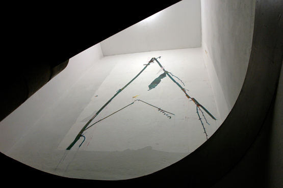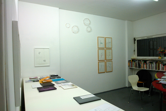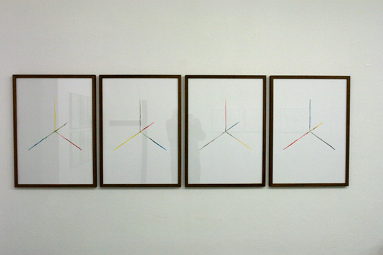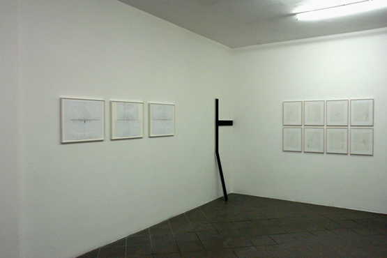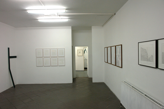 Neben kleinformatigen Papieren, die sich auf die Verläufe schwarzer Linien auf weissem Grund konzentrieren, stehen größere, bildmäßige Formate, direkt auf die Wand angebrachte Lineaturen sowie Erweiterungen der Linienkonstruktion selbst ins Dreidimensionale.