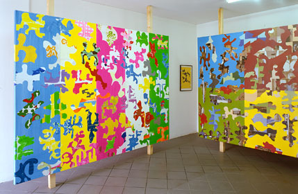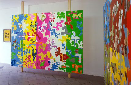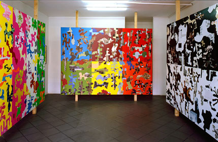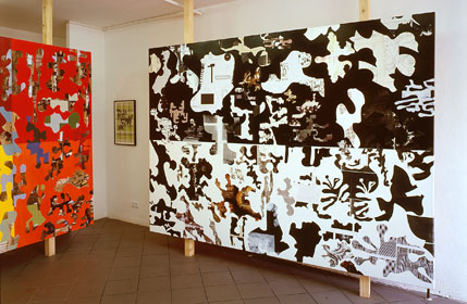 Dabei montiert er Scherenschnitte aus früheren Zeichnungen, Fotos, Katalogseiten, Kopien etc. auf farbig bearbeitete Flächen. Gezeigt werden drei Großformate, die den Galerieraum zu sprengen scheinen.