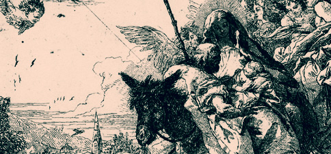 Giandomenico Tiepolo, 1727 in Venedig als ältester Sohn Giovanni Battista Tiepolos geboren, war Schüler seines bedeutenden Vaters und als solcher früh in dessen Werkstatt tätig. In seinem Oeuvre orientierte er sich an dessen Bildfindungen, die er in der ihm eigenen Art weiterentwickelte. Tiepolos "Flucht nach Ägypten" geht weit über die Darstellung der tradierten Motive hinaus und umfasst eine Folge von insgesamt 27 Radierungen, die mit ihrer Innovationskraft zu den Hauptwerken italienischer Graphik des 18. Jahrhunderts gehören. Sie entstanden mehrheitlich im zeitlichen Kontext der Ausmalung des Kaisersaals und des Treppenhauses der Neuen Residenz in Würzburg.